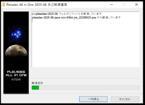 【pleiades-20xx-xx-xxxxxxxxxx.exe】フォルダを解凍すると、自己解凍書庫が起動し、あなたのインストール手順の補助をしてくれます。