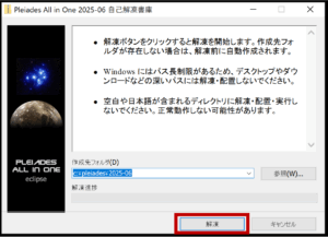 保存先を確認し、メモしておくとよいでしょう。そのまま解凍を押して次に進みます。デフォルトではCドライブ直下になっているかと思います。