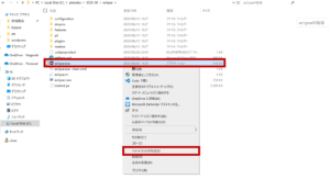 eclipse.exeファイルをクリックし、選択された状態で右クリックすると、開かれたメニューでショートカットの作成ができますので、「ショートカットの作成」を選択します。